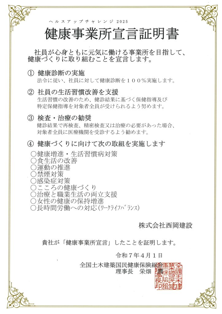 今年度も、全国土木建築国民健康保険組合が実施する『ヘルスアップチャレンジ』に参加しています。社員が健康に働ける会社を目指し、健康づくりの取組を続けてまいります。